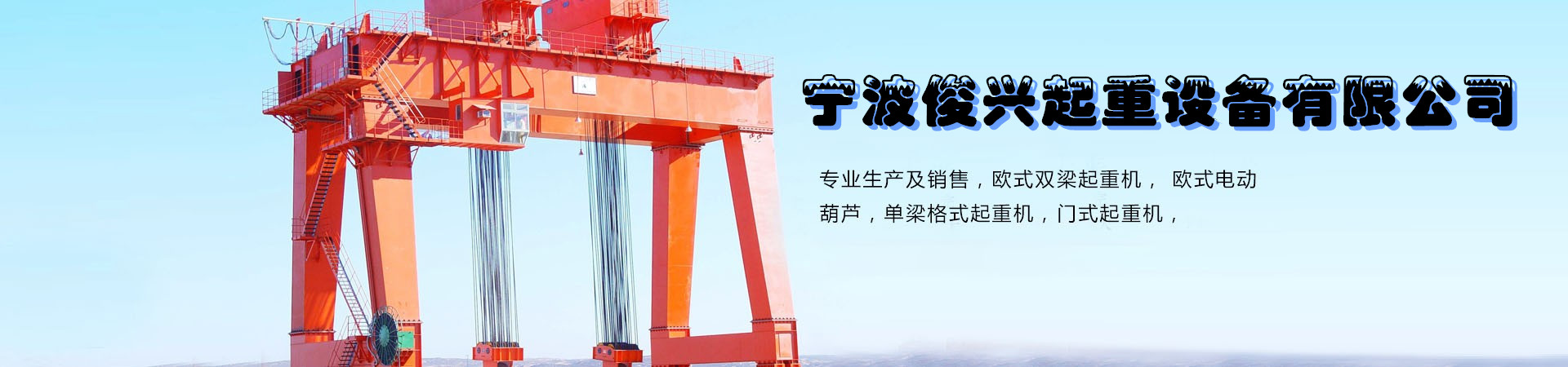 寧波俊興起重設備有限公司,公司負責人:徐丙俊先生,24小時銷售熱線:,本公司是河南礦山起重設備有限公司長沙總代理,河南中州智能起重設備有限公司長沙總代理,公司主營:單梁起重機、雙梁起重機、電動葫蘆、門式起重機、工程起重機、小型起重機械、單梁起重機配件、雙梁起重機配件、門式起重機配件、工程起重機配件等等。本公司是中國起重行業協會成員單位和中國重工協會理事單位。具有電動葫蘆、單、雙梁起重機生產許可證和製造、安裝、維修安全認可證及320T橋、門式起重機和280T鑄造吊製造安全認可證。嚴格的...【更多】