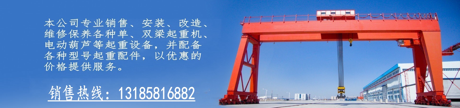 24小時服務熱線: 公司主要經營:溫州起重機、龍門吊、天車、天吊、行車、架橋機、提梁機、升降貨梯、升降平台、起重設備、單梁起重機、雙梁起重機、歐式起重機、門座式起重機、門式起重機、工程起重機、電動葫蘆、電動葫蘆配件、門式起重機配件、電動單梁起重機配件、雙梁橋式起重機配件、環鏈電動葫蘆、導軌式液壓升降機、電動平車、歐式電動葫蘆、懸臂起重機、KBK輕柔型起重機、液壓升降平台、升降搬運設備、小型起重機械、起重配套工具等起重配件。本公司專業銷售、安裝、改造、維修保養各種單、雙梁起重機、電動葫...【更多】