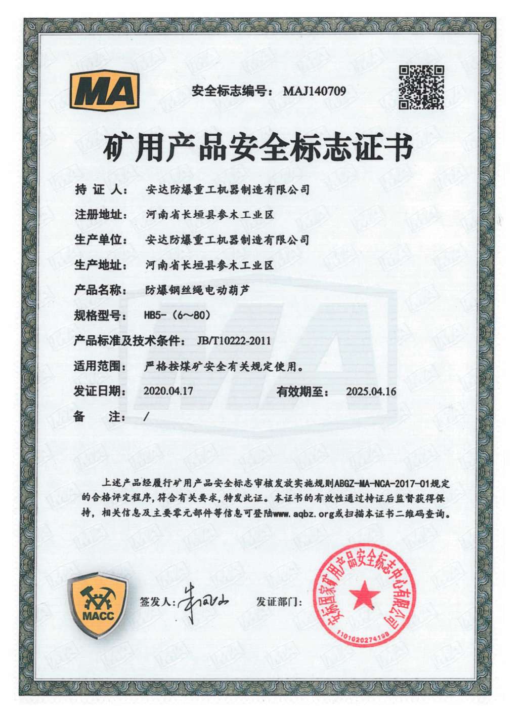 » 防爆鋼絲繩電動葫蘆 礦用產品安全標誌證書