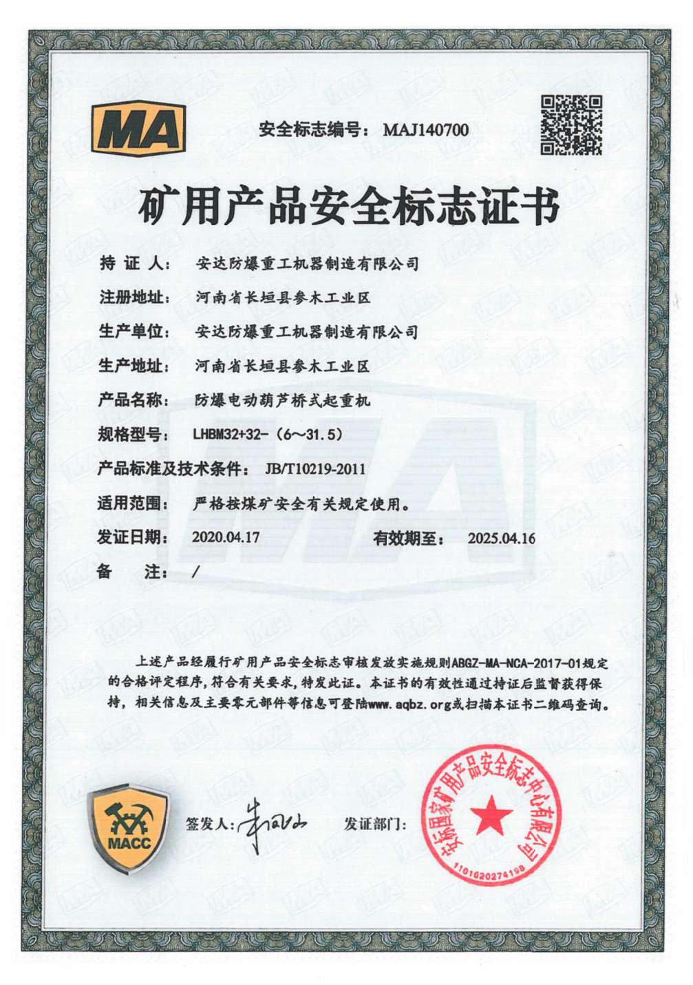 防爆鋼絲繩葫蘆橋式起重機 礦用產品安全標誌證書