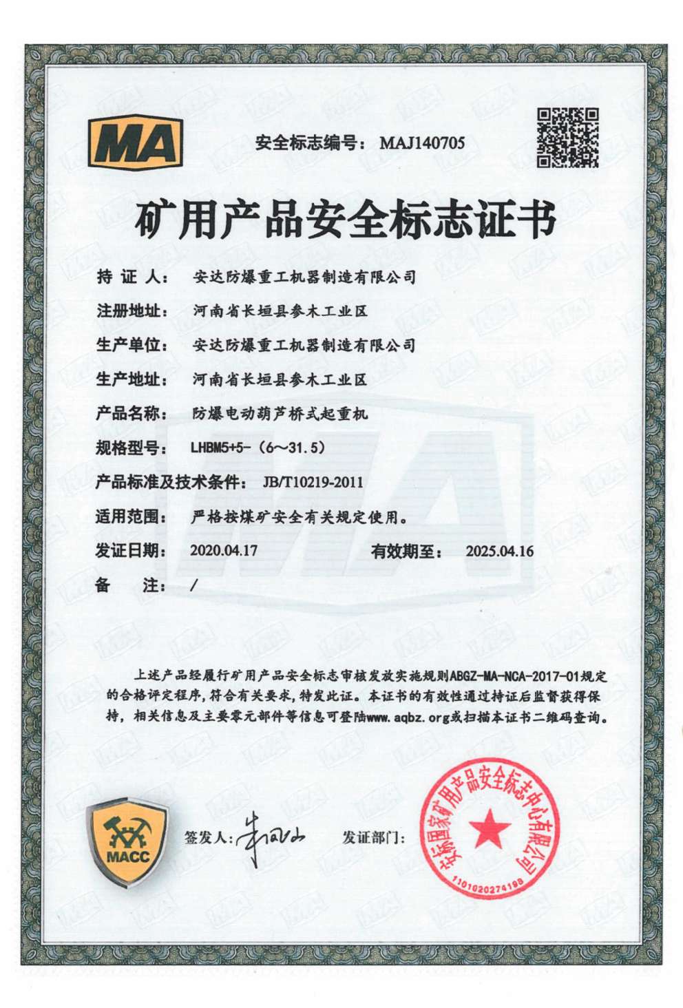 » 防爆鋼絲繩葫蘆橋式起重機 礦用產品安全標誌證書