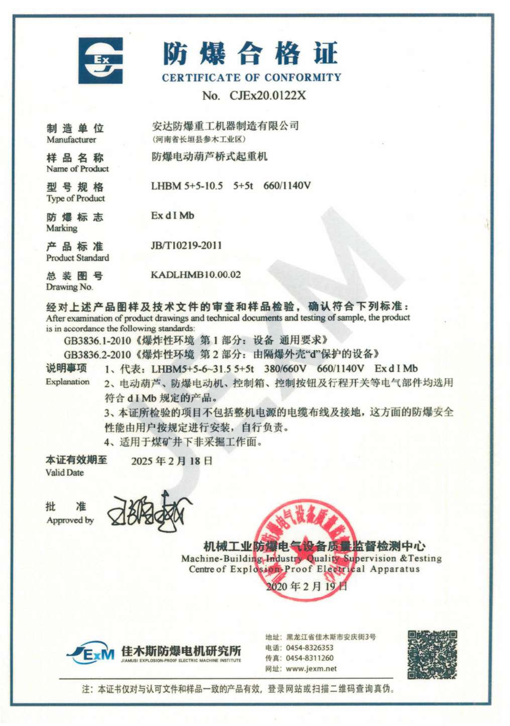 » 防爆電動葫蘆橋式起重機 防爆合格證