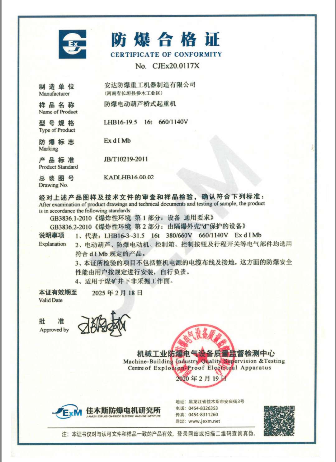 » 防爆電動葫蘆橋式起重機 防爆合格證