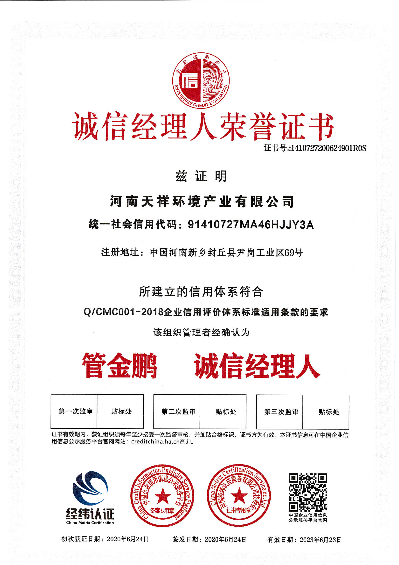 » 誠信經理人榮譽證書