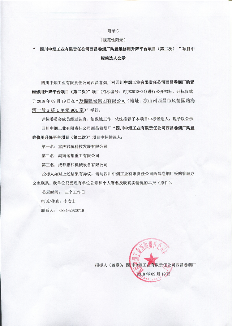 四川中煙工業有限責任公司西昌卷煙廠對四川中煙工業有限責任公司西昌卷煙廠購置維修用升降平台項目(第二次)”項目(招標編號:WJJS2018-24)進行公開招標。開標儀式於2018年09月19日在“萬錦建設集團有限公司(地址:涼山州西昌市風情園路海河一號3棟1單元901室)”舉行。