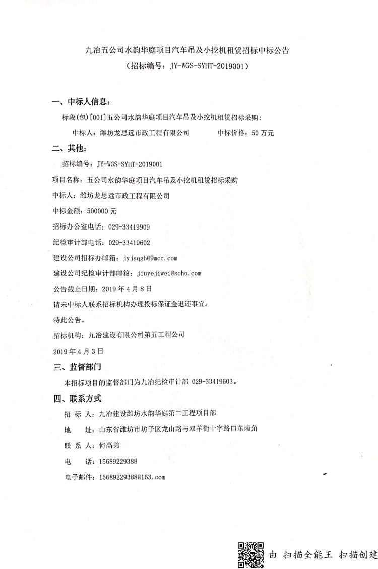 移動版:九冶五公司水韻華庭項目汽車吊及小挖機租賃招標中標公告