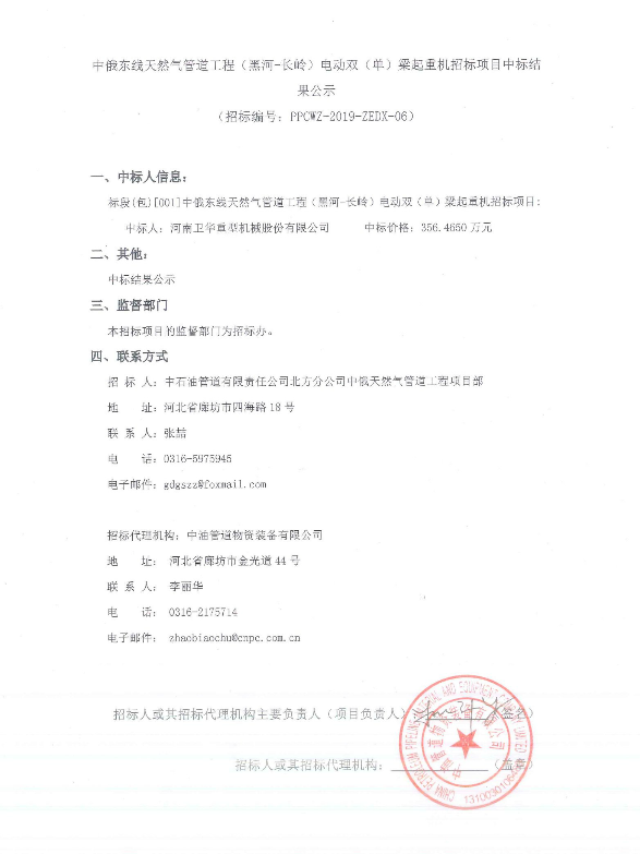 中俄東線天然氣管道工程(黑河-長嶺)電動雙(單)梁起重機招標項目中標結果公示