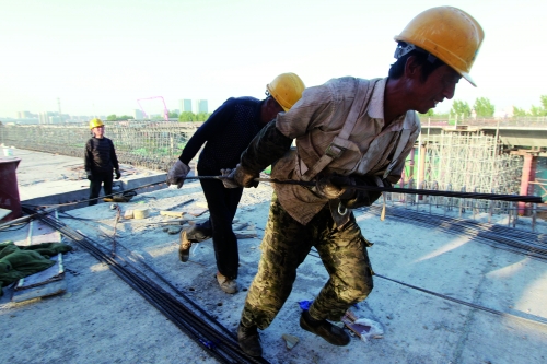工人在組裝承重鋼筋組