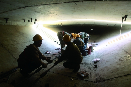 工人在橋梁空洞中為橋梁做臨時張拉