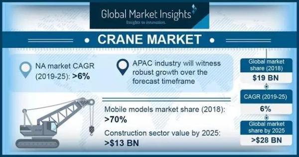 根據Global Market Insights, Inc的最新研究報告:到2025年,起重機市場規模將超過280億美元。從2019年到2025年,全球出貨量預計將以5.5%的複合年增長率增長。