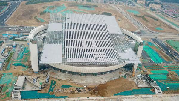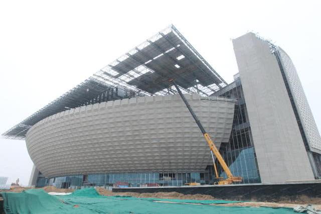 站在館內大廳,這邊電鑽嗡嗡作響,那邊焊光閃爍,腳手架有序排列著,工人們正在進行緊張施工。