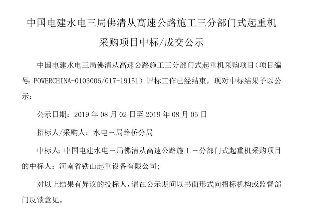 中國電建水電三局佛清從高速公路施工三分部門式起重機采購項目中標公示