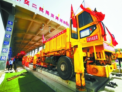 記(ji)者(zhe)在(zai)現(xian)場(chang)看(kan)到(dao),鋪(pu)軌(gui)開(kai)始(shi)後(hou),兩(liang)條(tiao)長(chang)長(chang)的(de)鋼(gang)軌(gui)先(xian)從(cong)運(yun)輸(shu)車(che)上(shang)送(song)入(ru)前(qian)方(fang)等(deng)待(dai)的(de)黃(huang)色(se)牽(qian)引(yin)車(che),隨(sui)後(hou)在(zai)牽(qian)引(yin)車(che)的(de)牽(qian)引(yin)下(xia),整(zheng)條(tiao)鋼(gang)軌(gui)被(bei)慢(man)慢(man)拉(la)出(chu),最(zui)終(zhong)落(luo)在(zai)無(wu)砟(zha)軌(gui)道(dao)板(ban)上(shang)。500米長的兩條鋼軌,僅僅用了1小時就鋪設到位。