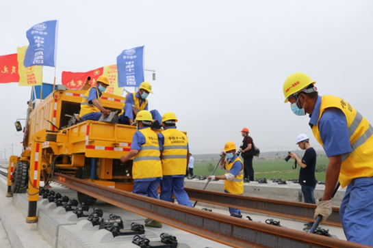 6月12日,鹽通高鐵東台站施工現場,鋪軌機牽引著一組500米長鋼軌平穩地落在無砟道床上,此舉標誌著國家“八縱八橫”高速鐵路主通道之一的鹽通高鐵工程建設整體從線下施工轉入到線上鋪軌階段。