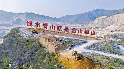 沿著首都地區環線高速蔣福山高速口駛出,“綠水青山就是金山銀山”的十個紅色大字招牌映入眼簾。在三河東部礦山治理區五期項目現場,數十台挖掘機、運輸車、碾壓機往來穿梭,機聲隆隆。已種植成活的喬木、灌木綠意盎然,與旁邊光禿灰白的岩土形成鮮明對比。