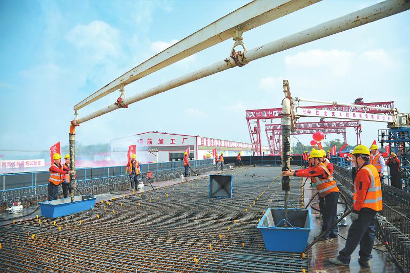 箱梁預製在位於自貢市沿灘區的中鐵北京工程局自宜鐵路項目鄧關製梁場進行。箱梁成“U”狀,長32米、寬12.6米、高3.05米,可鋪設雙線軌道。9時許,隨著一聲令下,2輛混凝土罐車齊齊開動,混凝土噴漿而出,從位於“二樓”的箱梁表麵層滲漏進模具裏;箱梁腰身部位,數名施工人員和技術人員忙著進行混凝土澆築維護作業。
