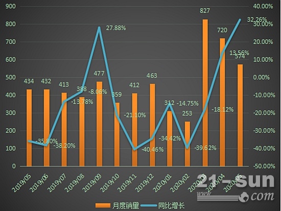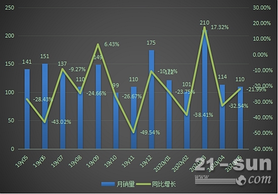 數據顯示,2020年5月份,國內主要推土機製造企業合計銷售推土機574台,同比增長32.26%,連續兩個月正增長,且創下近1年來的最高增長幅度。其中標準型和濕地型推土機分別銷售267台和307台。2020年1-5月,共銷售推土機2686台,同比下滑6.18%,降幅繼續收窄。