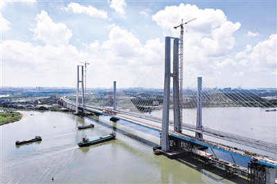 移動版:廣州南沙港鐵路跨西江特大斜拉橋完成最後一塊鋼箱梁吊裝