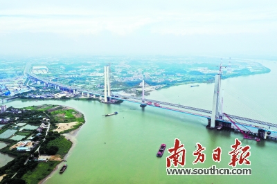 廣州南沙港鐵路跨西江斜拉橋成功合龍,這也是目前世界雙線貨運鐵路建設史上同類型結構跨度最大的斜拉橋。南方日報記者 楊興樂 攝