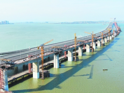 13日夜間,新建福廈鐵路泉州灣跨海大橋首個梁體順利合龍,為後續架梁、上部結構施工等奠定了基礎。此次合龍的梁體位於泉州灣海域靠近石獅北互通匝道區。圖為14日上午拍攝的已完成首個梁體合龍施工的泉州灣跨海大橋。( 來源: 福建日報 記者 王毅 通訊員 周毅 占雨欣 攝)