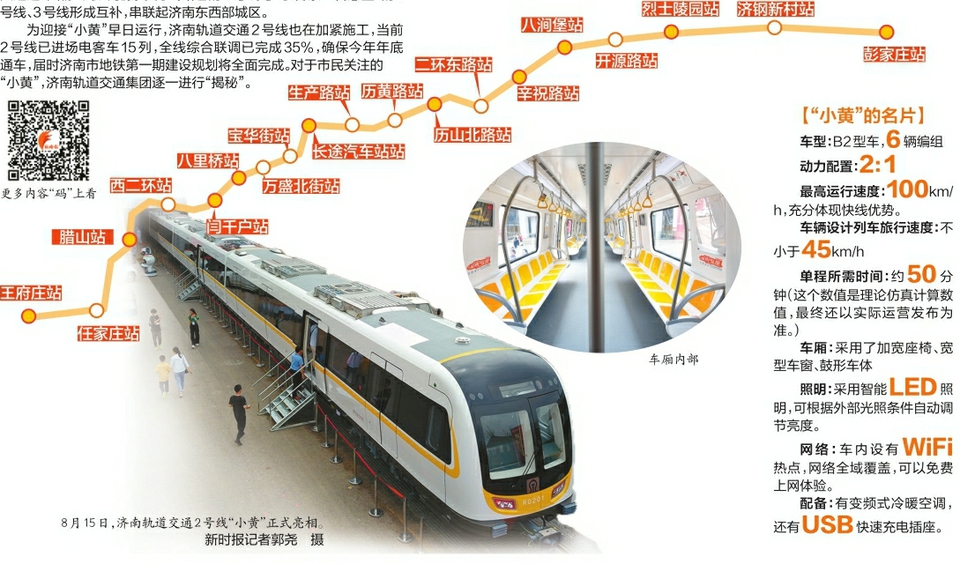 為迎接“小黃”早日運行,濟南軌道交通2號線也在加緊施工,當前2號線已進場電客車15列,全線綜合聯調已完成35%,確保今年年底通車,屆時濟南市地鐵第一期建設規劃將全麵完成。對於市民關注的“小黃”,濟南軌道交通集團逐一進行“揭秘”。