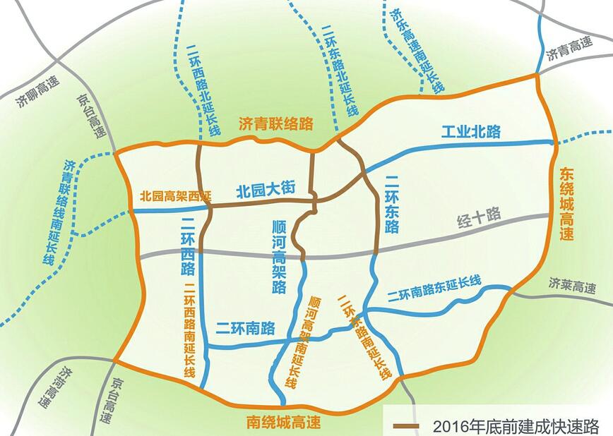 1997年,濟南第一條城市高架——順河快速路開建。截至2016年底,濟南共建成順河、北園、二環東、二環西、二環南等共計53公裏的城市快速路。