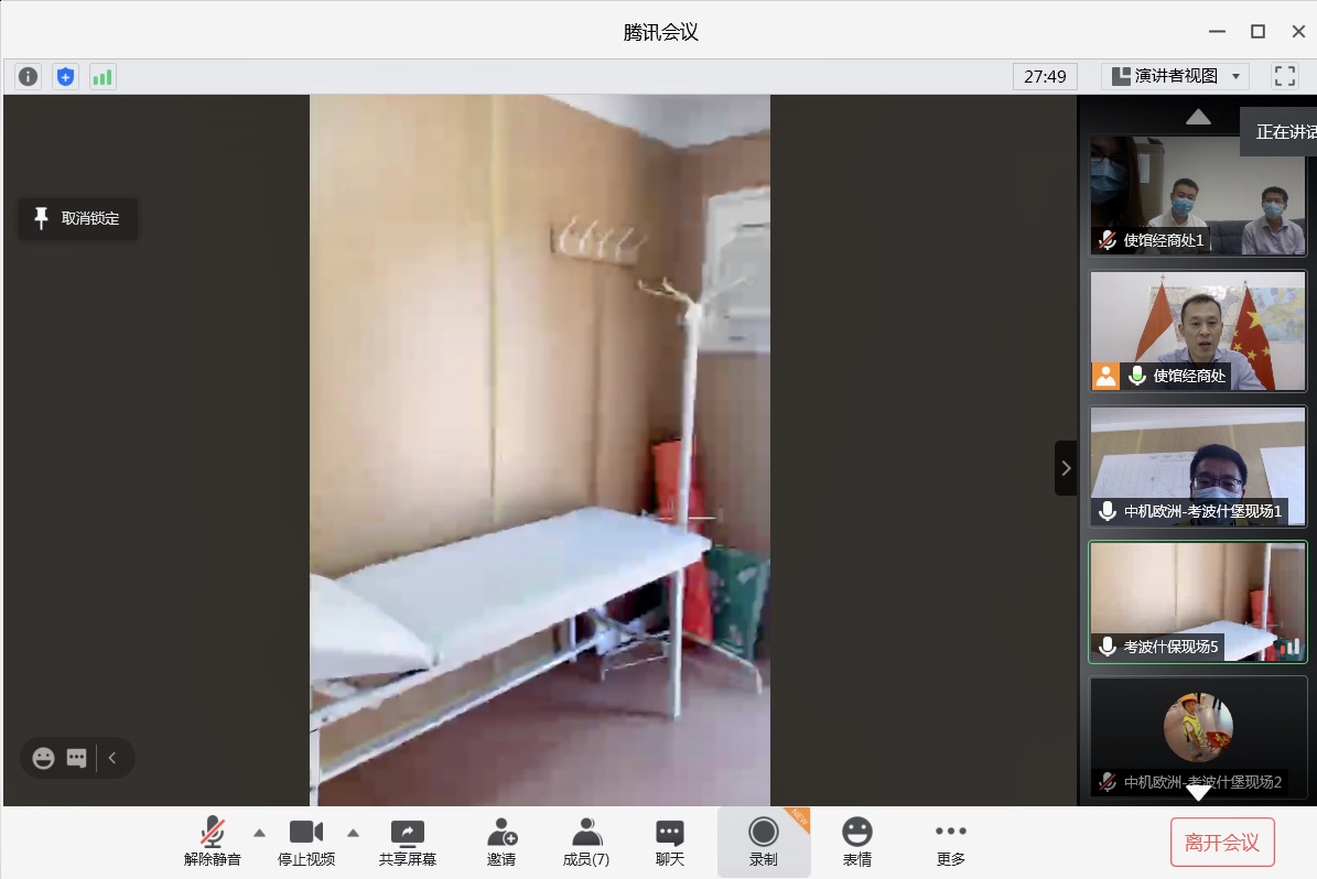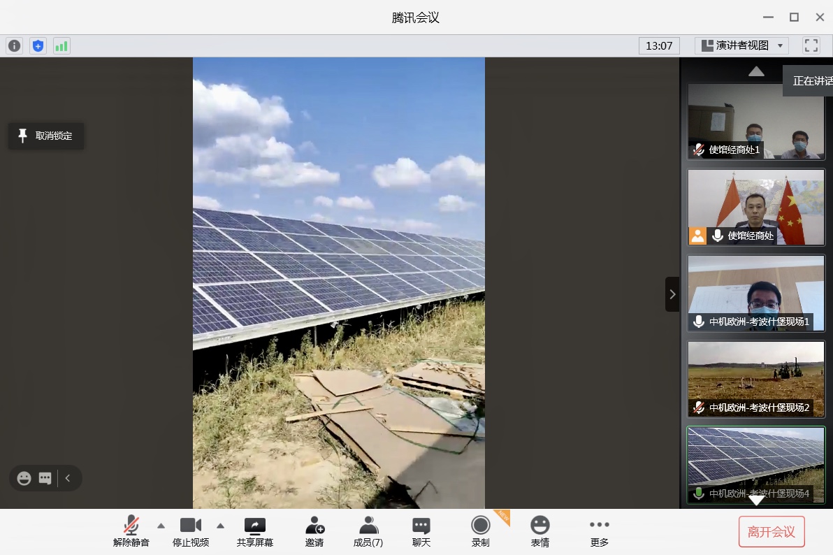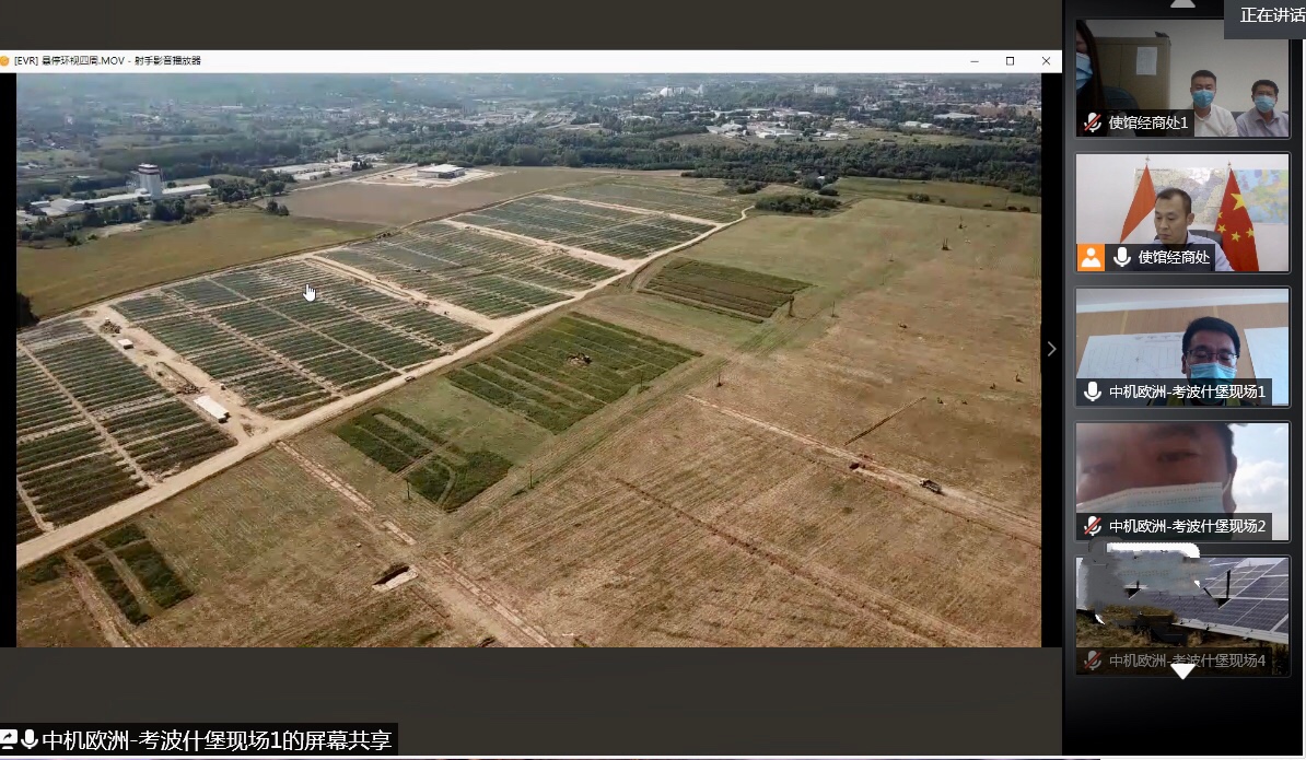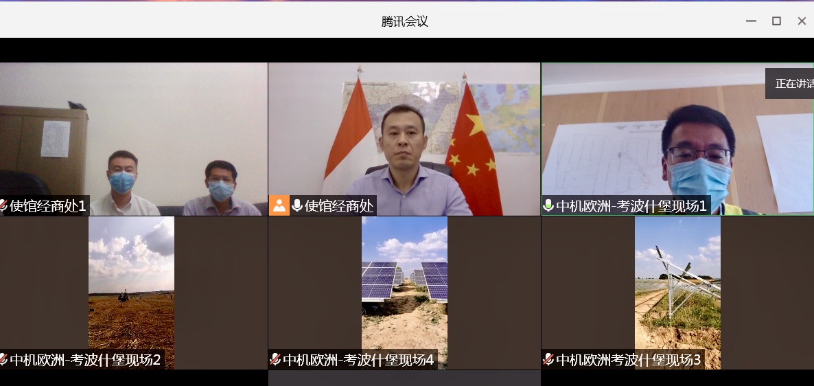 近期,匈牙利疫情嚴重反彈,我在匈企業和項目麵臨多重風險。為保障我在匈中資企業和項目安全運行,9月15日,劉波公使銜經濟商務參讚視頻連線中國機械進出口公司考波什堡100兆瓦光伏電站項目施工現場,對其疫情防控和安全生產工作進行遠程督導。經商處馮春一秘、周一一秘、劉沛君二秘陪同參加。