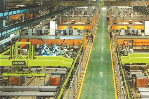 中聯重科常德塔機智能工廠一期工程,擁有12條自動化生產線,1萬多個傳感器、100多台工業機器人、35台無人搬運小車、16套數控加工中心等先進設備,平均每10分鍾產出1節標準節,每90分鍾生產一條起重臂。 湖南日報·華聲在線記者 唐俊 攝