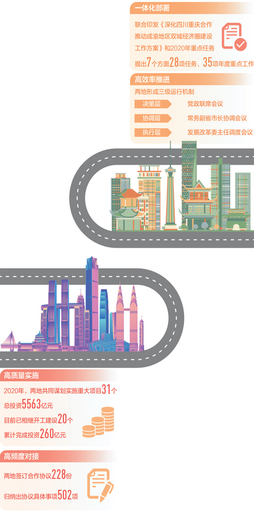 2020年,是雙城攜手共進、大手筆接連不斷的一年:牽手31個重大項目,總投資5563億元;能源一體化正加速,20個重大項目總投資約9900億元;雙城攜手多地共同推進西部陸海新通道建設,共建省際協商合作聯席會議製度;兩省市有關部門、市區(縣)簽署各類協議228份,多數事項進展良好……