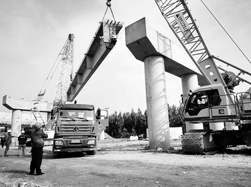 昨日,記者在中華大街北延跨北繞城高速公路施工現場,看到一片熱火朝天的施工場麵,吊車正懸掛起一根預製T型梁進行橋梁架設,已經吊裝到位的T型梁正在進行橫隔板混凝土澆築。在北側不遠處,伴著“隆隆”的轟鳴聲,壓路機、瀝青攤鋪機等機械一起開工,路基作業正在全麵展開。
