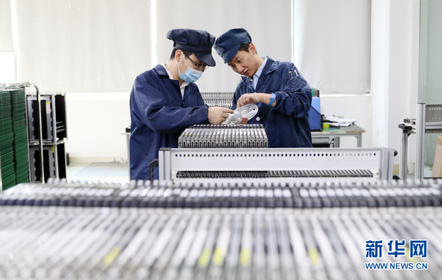 在科大智能SMT車間生產線,工作人員正在查看生產情況。