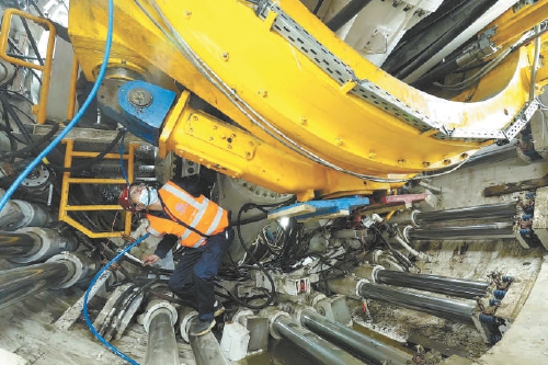 此次盾構始發的04標工程體育中心站至平房村站區間全長2063米,中途要穿東五環和南水北調幹渠。“鐵軍三號”盾構機開挖直徑6.68米,為土壓平衡式盾構機。這台盾構機總長約85米,重約500噸,最大推進速度為每分鍾80毫米。盾構的推進、出土、拚(pin)裝(zhuang)襯(chen)砌(qi)等(deng)全(quan)過(guo)程(cheng)均(jun)自(zi)動(dong)化(hua)作(zuo)業(ye),一(yi)次(ci)成(cheng)型(xing),降(jiang)低(di)了(le)施(shi)工(gong)風(feng)險(xian),對(dui)地(di)麵(mian)交(jiao)通(tong)與(yu)設(she)施(shi)的(de)影(ying)響(xiang)更(geng)小(xiao)。京(jing)投(tou)所(suo)屬(shu)軌(gui)道(dao)公(gong)司(si)相(xiang)關(guan)負(fu)責(ze)人(ren)介(jie)紹(shao),這(zhe)是(shi)北(bei)京(jing)地(di)鐵(tie)3號線一期首台盾構機始發。