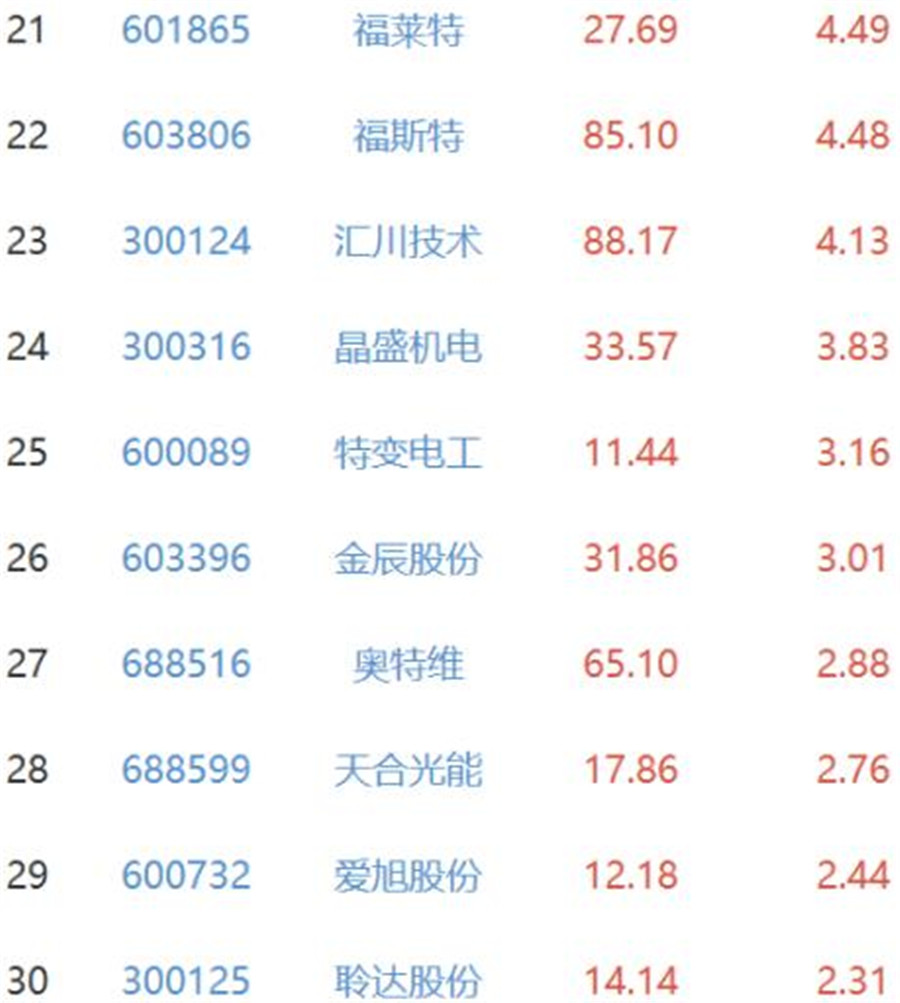 此次上漲的光伏股都是行業內的細分產業領軍企業,比如組件類包括:天合光能、晶澳科技、隆基股份、東方日升等。在多晶矽、矽片等上遊,通威股份、中環股份、新特能源等也在大漲個股中。逆變器方向上,錦浪科技、上能電氣、陽光電源及固德威等全部暴漲。電池及輔材方向上,愛旭科技、福斯特、福萊特、海優新材、中信博、亞瑪頓等都有所上揚。龍頭股和成長股顯現了良好的漲幅走勢。