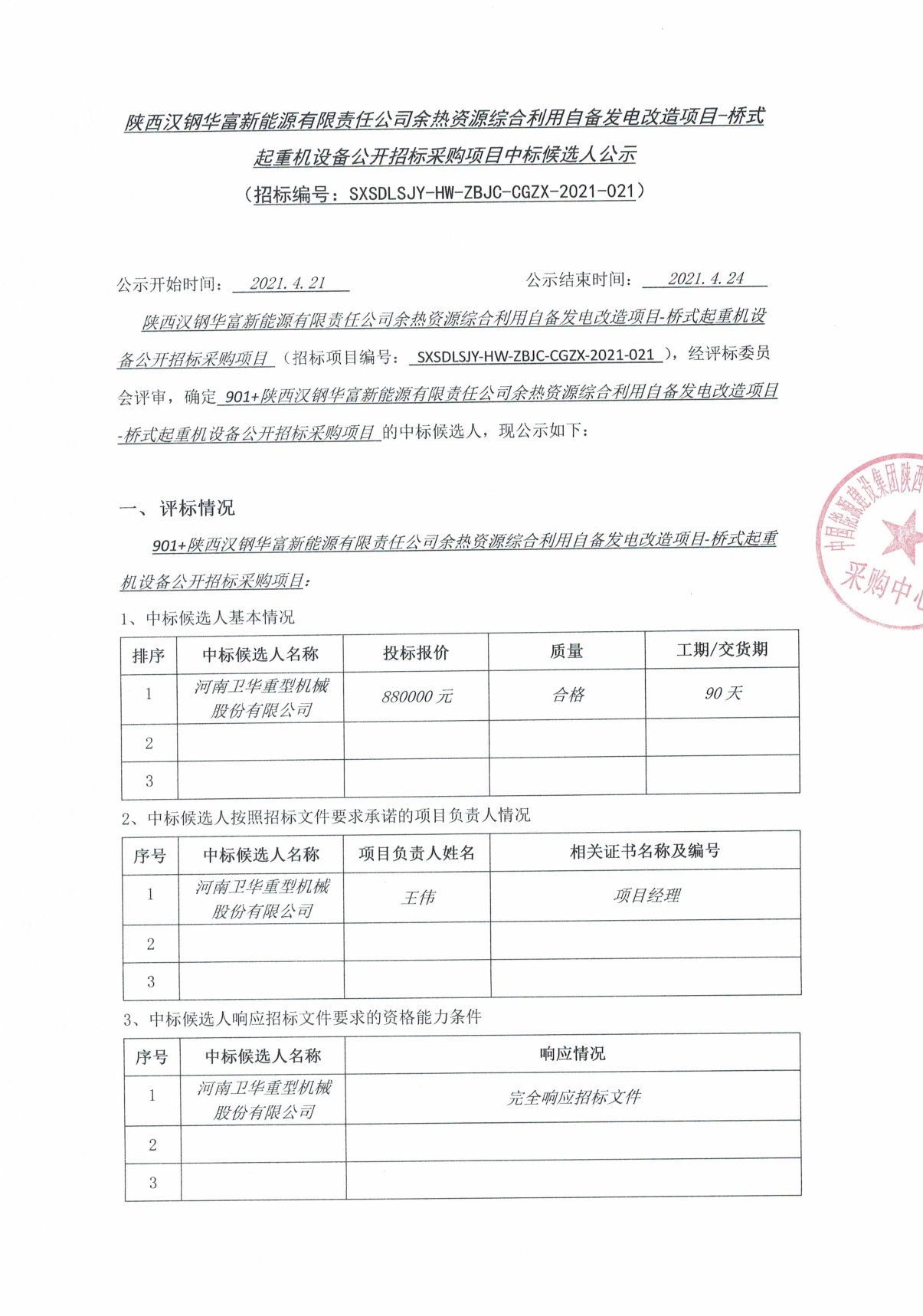 陝西漢鋼華富新能源有限責任公司餘熱資源綜合利用自備發電改造項目-橋式起重機設備公開招標采購項目中標候選人公示 SWF文件鏈接