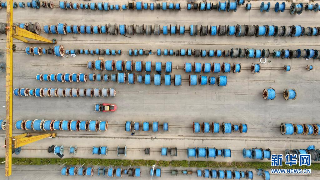 4月22日,工人在河北省寧晉縣一家電線電纜生產企業內運輸電纜(無人機照片)。