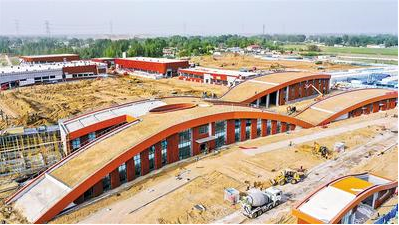 幾ji座zuo紅hong褐he色se融rong入ru流liu水shui元yuan素su的de曲qu線xian造zao型xing建jian築zhu物wu依yi次ci排pai開kai,給gei人ren以yi靈ling動dong之zhi感gan。六liu百bai餘yu名ming中zhong建jian安an裝zhuang集ji團tuan有you限xian公gong司si的de施shi工gong人ren員yuan緊jin張zhang有you序xu地di進jin行xing裝zhuang飾shi裝zhuang修xiu、設備安裝調試以及道路施工。