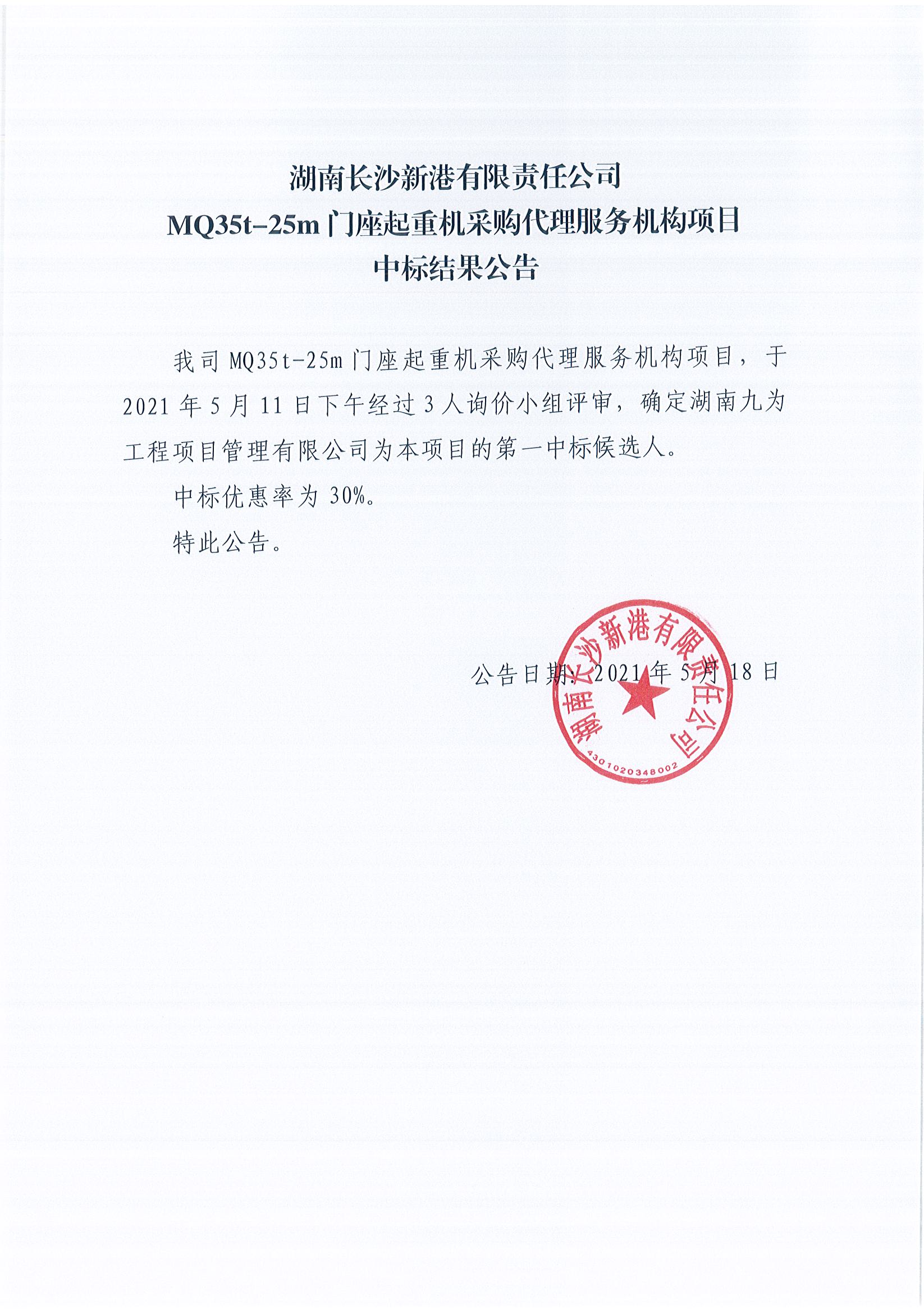 招標公司受業主委托,於2021-05-18在網上發布:湖南長沙新港有限責任公司MQ35t-25m門(men)座(zuo)起(qi)重(zhong)機(ji)采(cai)購(gou)代(dai)理(li)服(fu)務(wu)機(ji)構(gou)項(xiang)目(mu)中(zhong)標(biao)結(jie)果(guo)公(gong)告(gao)。各(ge)有(you)關(guan)單(dan)位(wei)請(qing)與(yu)公(gong)告(gao)中(zhong)招(zhao)標(biao)負(fu)責(ze)人(ren)接(jie)洽(qia)聯(lian)係(xi),及(ji)時(shi)開(kai)展(zhan)投(tou)標(biao)及(ji)相(xiang)關(guan)工(gong)作(zuo),以(yi)免(mian)錯(cuo)失(shi)商(shang)業(ye)機(ji)會(hui)。