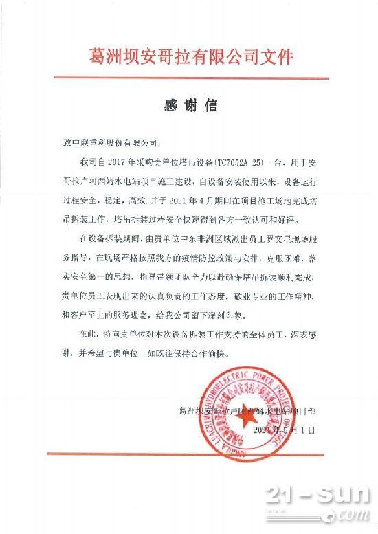 葛洲壩安哥拉有限公司發送給中聯重科的感謝信
