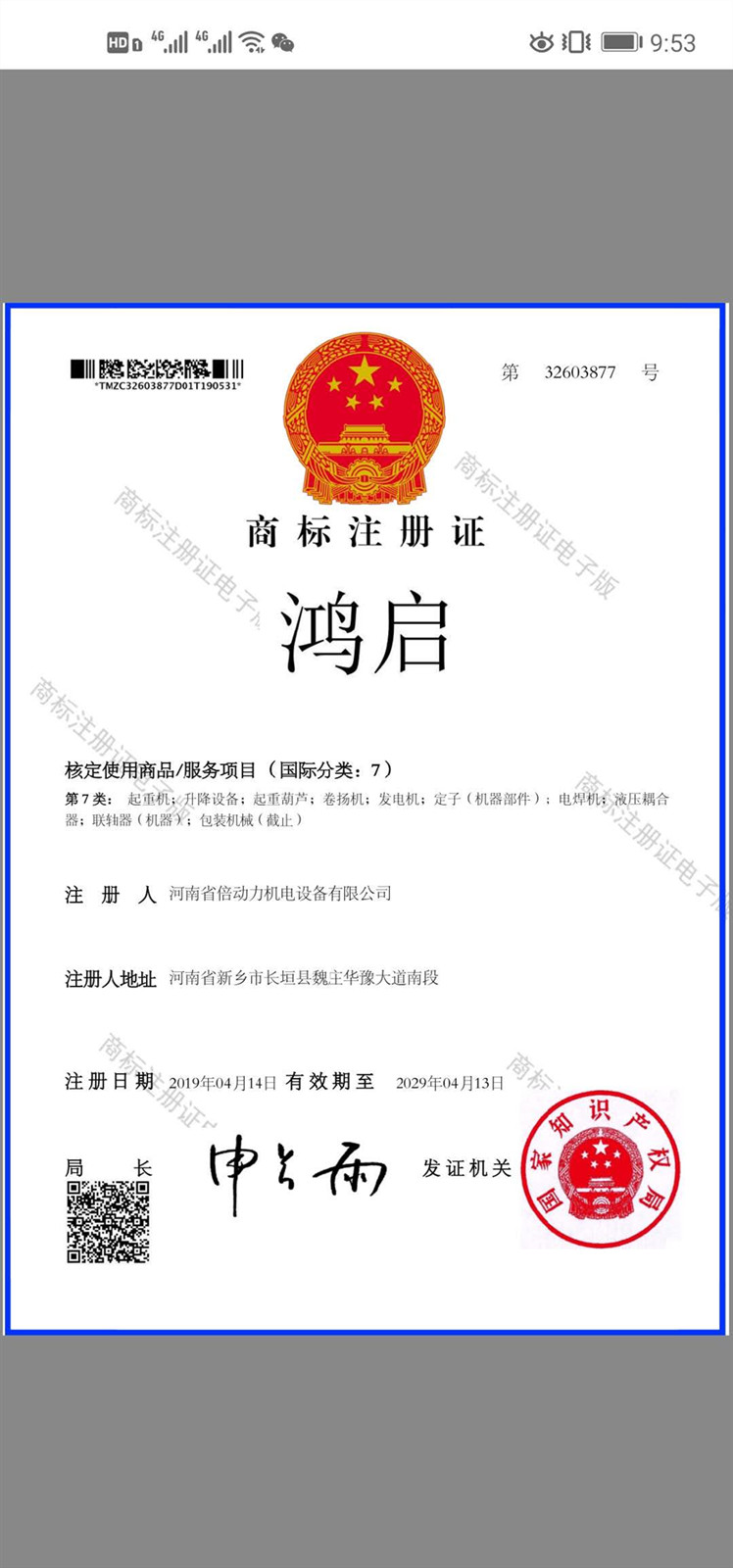 河南省倍動力機電設備有限公司 鴻啟 牌商標