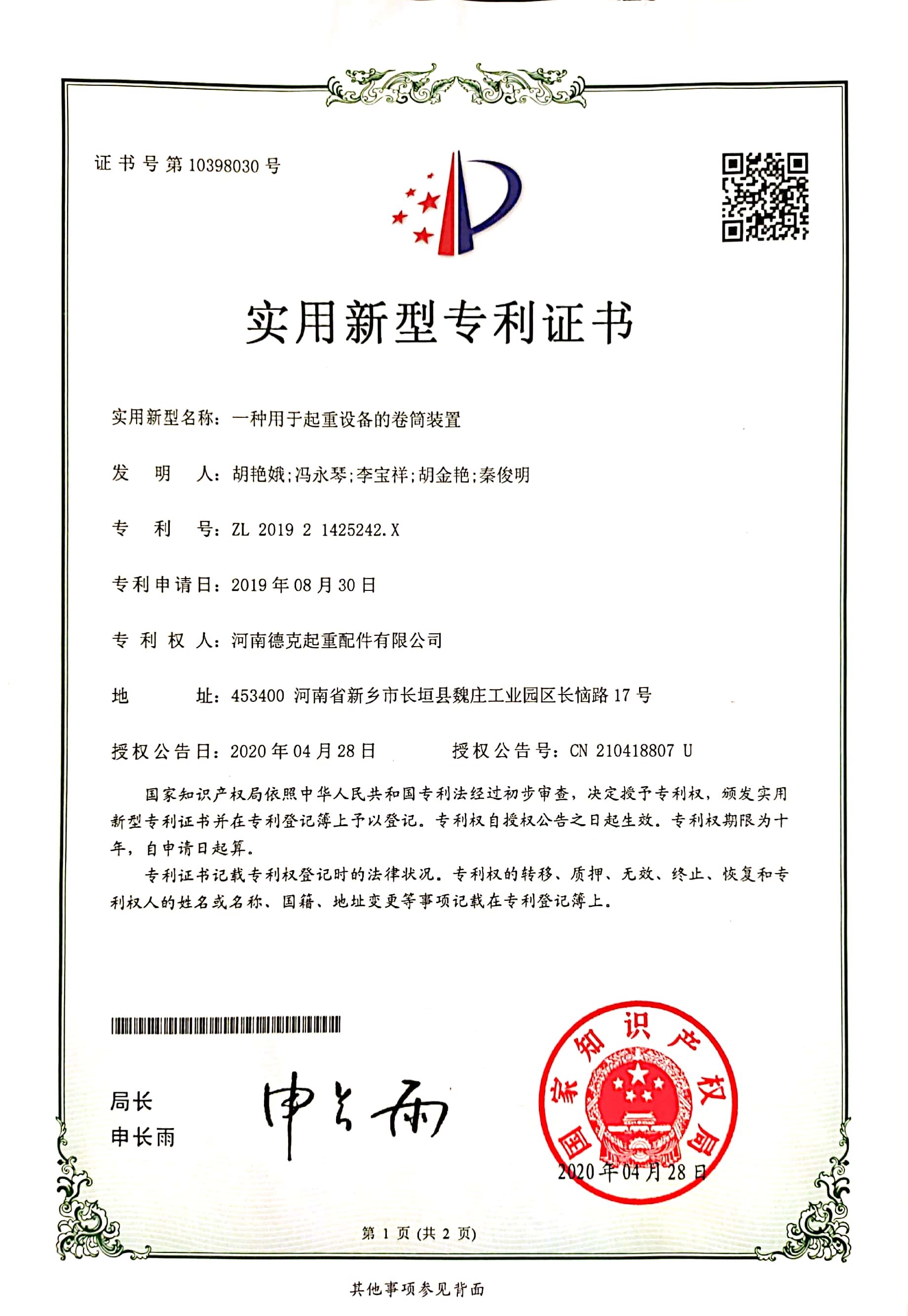 » 實用新型專利證書