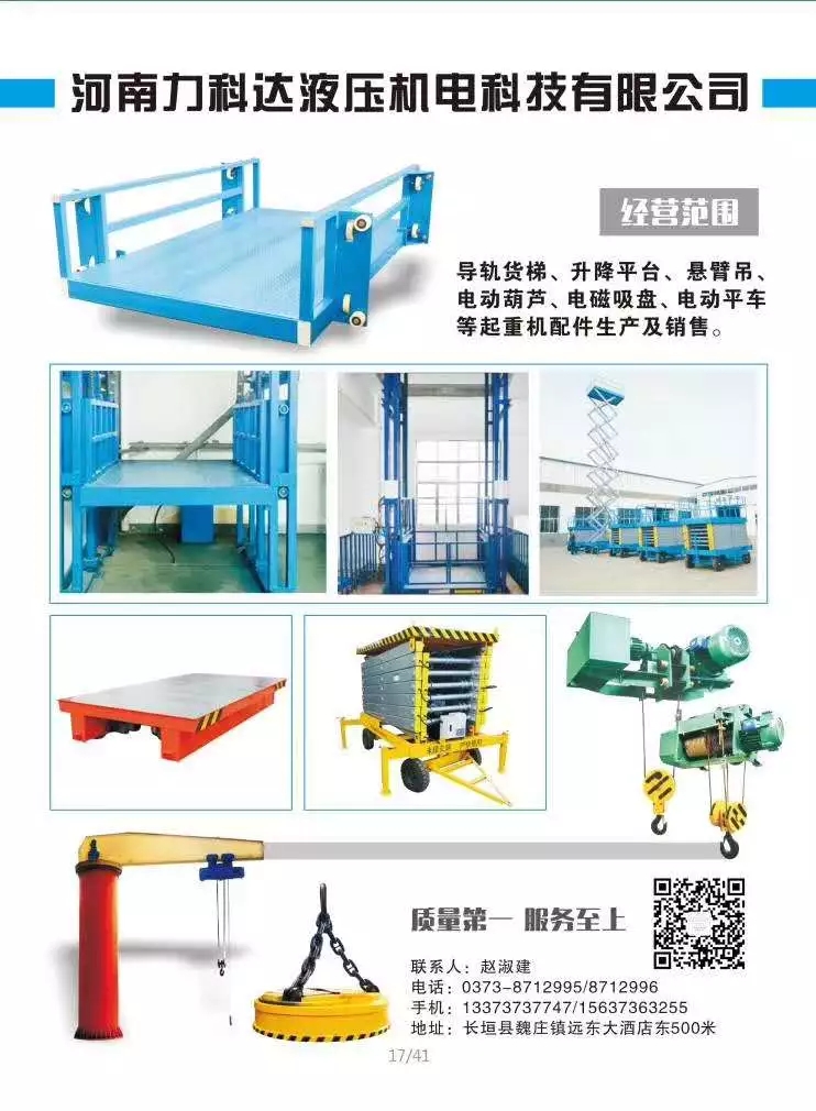 力科達,主營導軌貨梯,升降平台,電動平車,懸臂吊,電磁吸盤等起重配件。