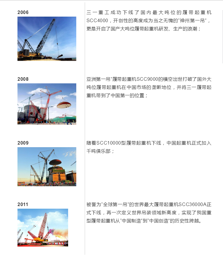 20世紀初的中國,超大噸位的起重設備由於技術的複雜性、嚴苛性,一直被國外品牌壟斷。2004年,三一重工以50噸、80噸和150噸dun履lv帶dai起qi重zhong機ji為wei敲qiao門men磚zhuan正zheng式shi敲qiao開kai履lv帶dai式shi起qi重zhong機ji的de大da門men後hou,獨du辟pi蹊qi徑jing,不bu斷duan切qie入ru大da噸dun位wei領ling域yu,相xiang繼ji向xiang市shi場chang推tui出chu一yi款kuan款kuan大da噸dun位wei履lv帶dai起qi重zhong機ji,以yi後hou來lai者zhe居ju上shang的de勇yong氣qi,邁mai著zhe創chuang新xin的de步bu伐fa前qian行xing,不bu斷duan刷shua新xin中zhong國guo乃nai至zhi世shi界jie紀ji錄lu,成cheng為wei名ming副fu其qi實shi的de“履帶上的吊裝專家”。