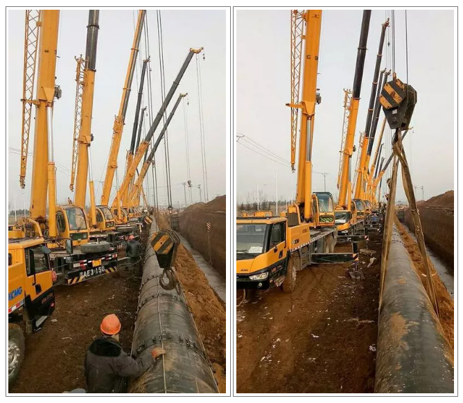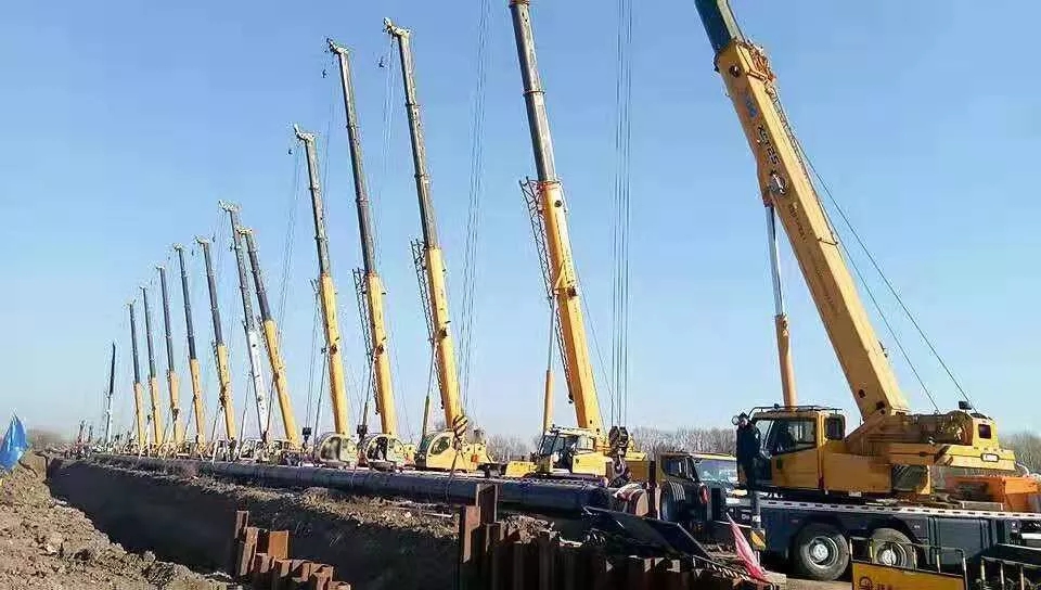 140米長的管道,10餘台徐工25噸起重機群集合力,每台車吊裝4.5噸左右,伸出20多米大臂,半徑13米,助力沈陽渾南區燃氣管道工程建設。