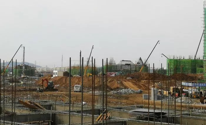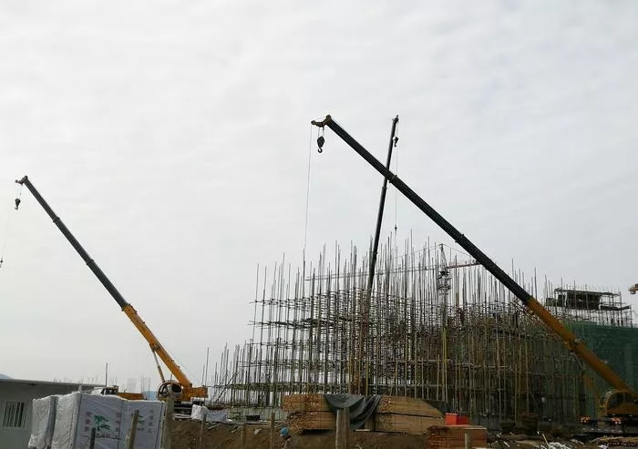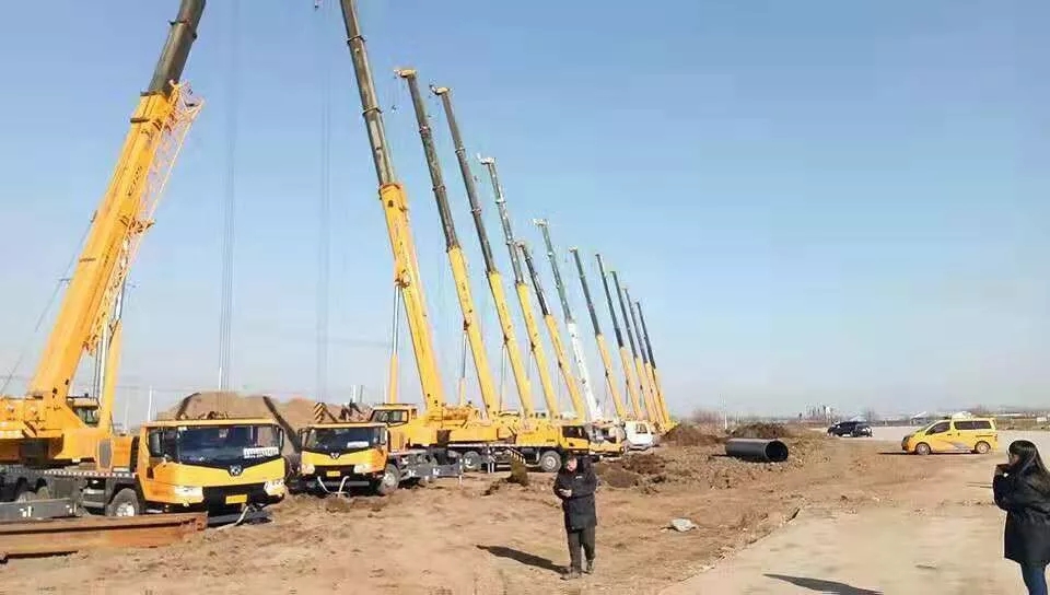 8台徐工K係列起重機(QY25K5-1、QY20G等)舉起金色臂膀,打樁、安裝塔吊,以高效的施工效率完成吊裝作業,助力石島鎮房地產建設。