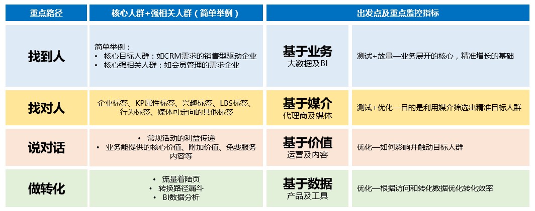 也是上一篇文章中問的問題,目標用戶是哪些?比如職業培訓行業有職業培訓需求的職場人士、電商行業是有購物需求的愛美的女士(以前有一個好玩的營銷心理的說法:老人要健康,兒童要聰明,女人愛美,男人好色),如果業務模式對應的人群比較清晰,找到人相對容易一點,如果目標人群的屬性相對比較複雜,或者像B2B企業目標人群的決策鏈比較長,就需要對業務更多的了解才能有比較清晰的人群方向。
