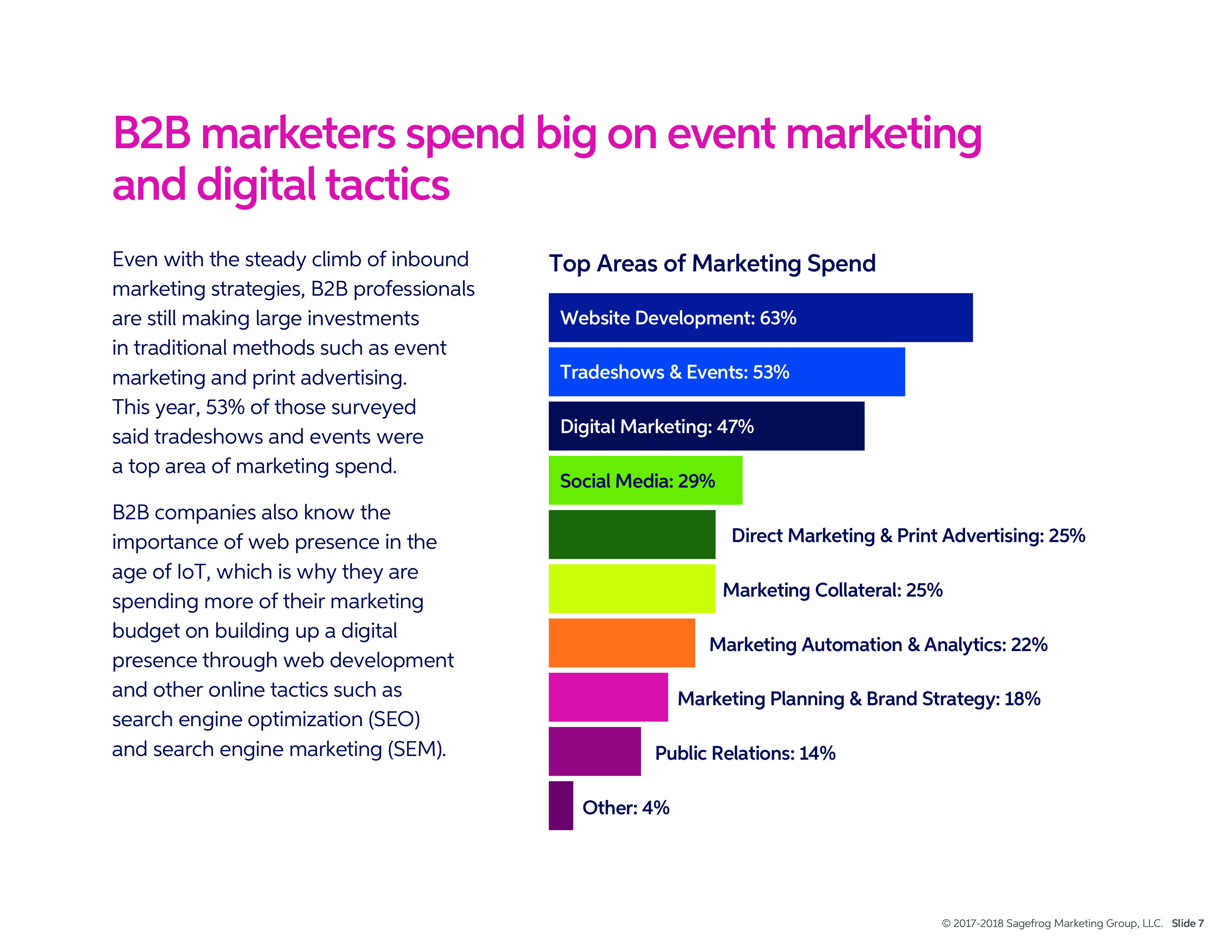 53%的受訪者表示貿易展和活動是營銷支出的最大領域。當然,B2B公司也知道網絡的重要性,因此也在投資網絡開發和在線營銷策略。