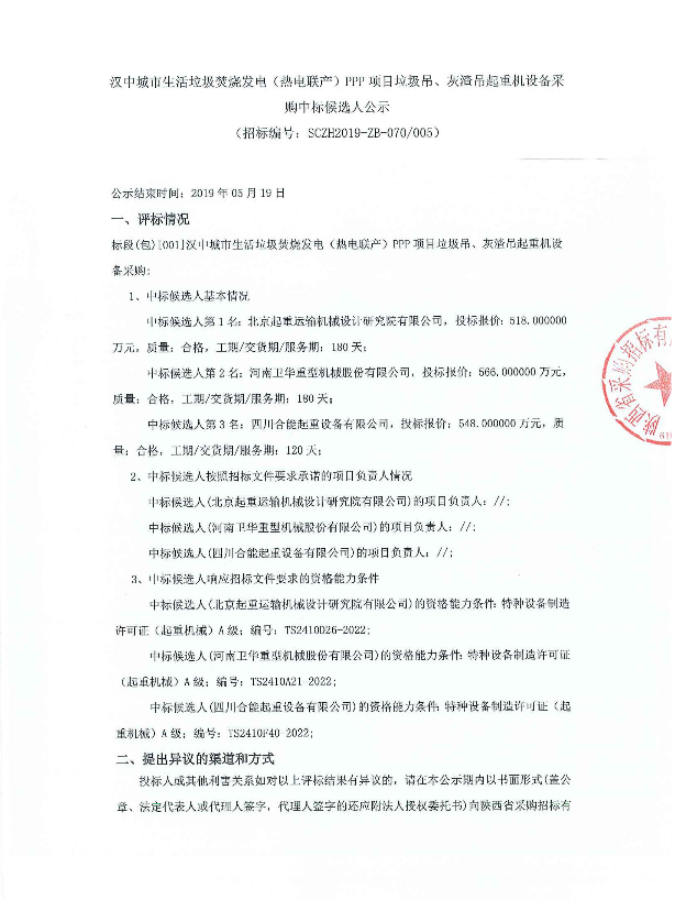 漢中城市生活垃圾焚燒發電(熱電聯產)PPP項目垃圾吊、灰渣吊起重機設備采購中標候選人公示