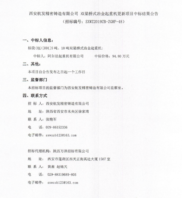 西安航發精密鑄造有限公司 雙梁橋式冶金起重機更新項目中標結果公告
