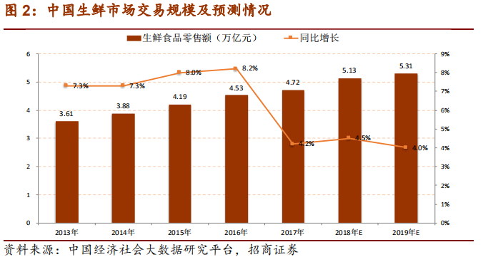 根據招商證券的一份相關報告,我國生鮮市場在2018年同比增速有所減緩,但市場整體規模仍在不斷擴大,其預計在2019年將達到5.31萬億規模。