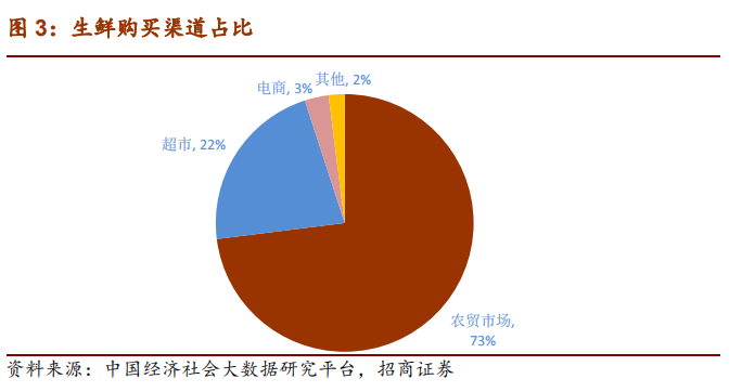 同時數據顯示,傳統農貿市場依然是我國居民購買生鮮的主要渠道,占比約 73%。超市渠道占比 22%,為第二大渠道。目前生鮮消費被電商渠道分流的並不多,占比約 3%。